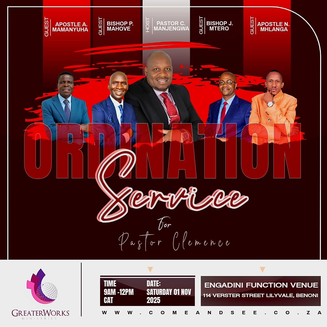 Join us to witness the ordination of Apostle Clemence Manjengwa – a momentous occasion marking a divine elevation a new chapter at Greater Works Ministries International. Join us and come and be part of this historic celebration also witnessing a powerful move of God as four highly esteemed guest speakers, mighty vessels of grace and elevation minister under one roof. Don’t just hear about it, come and experience it!